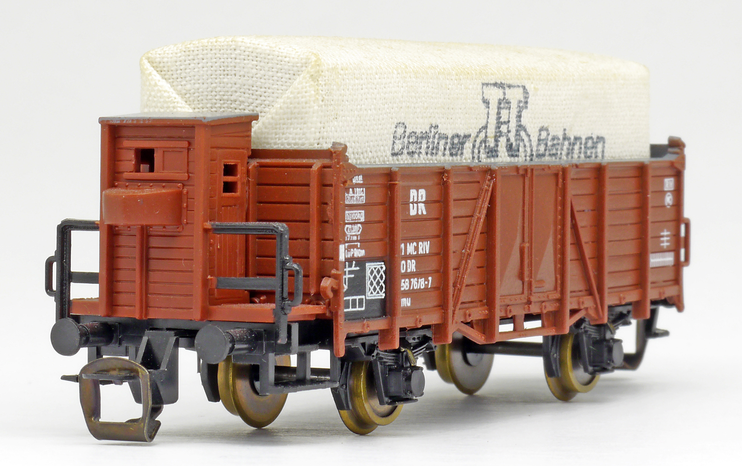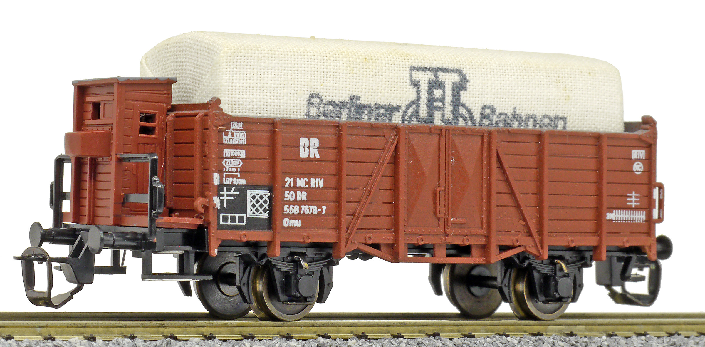 | otevřený nákladní vůz červenohnědý s brzdařskou budkou a plachtou |