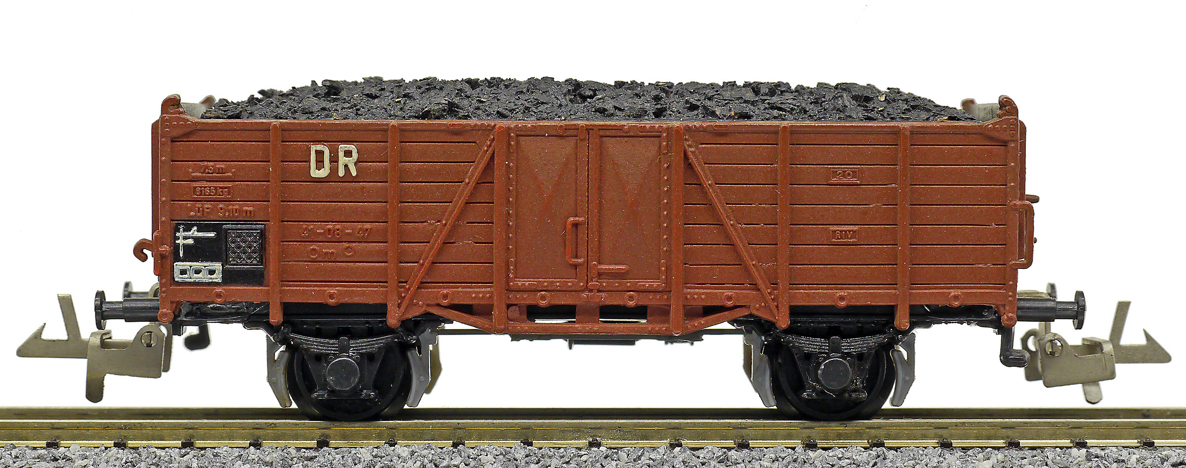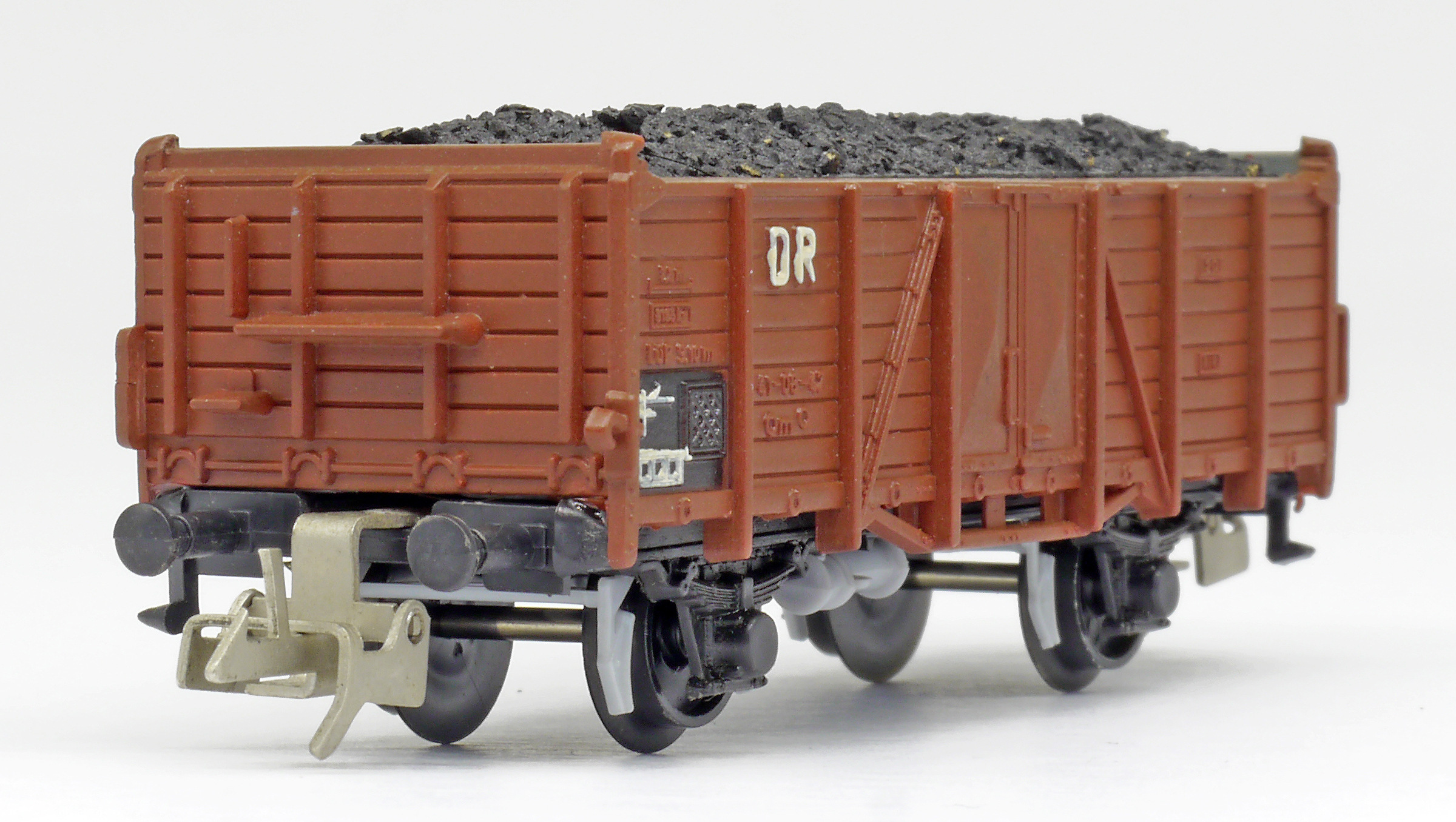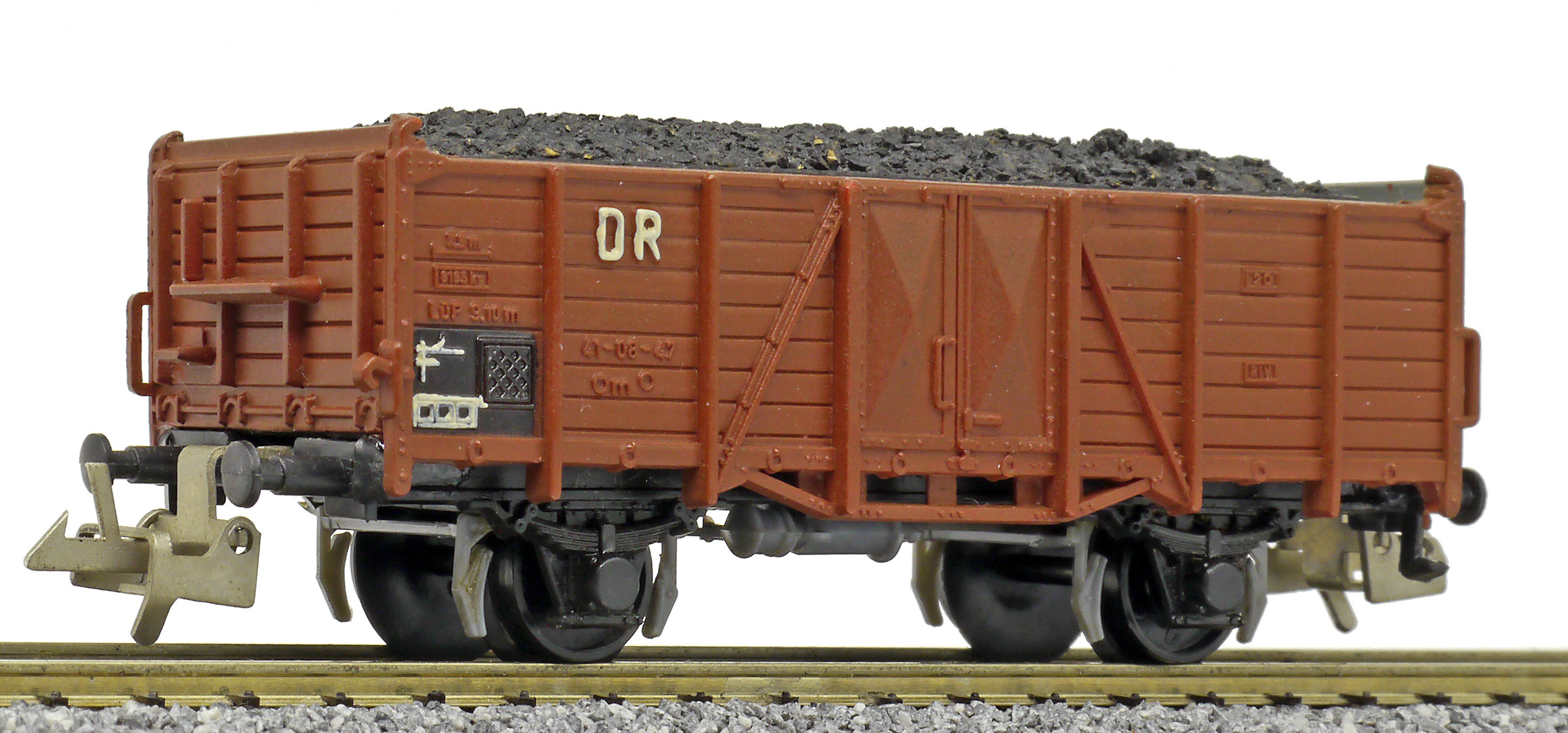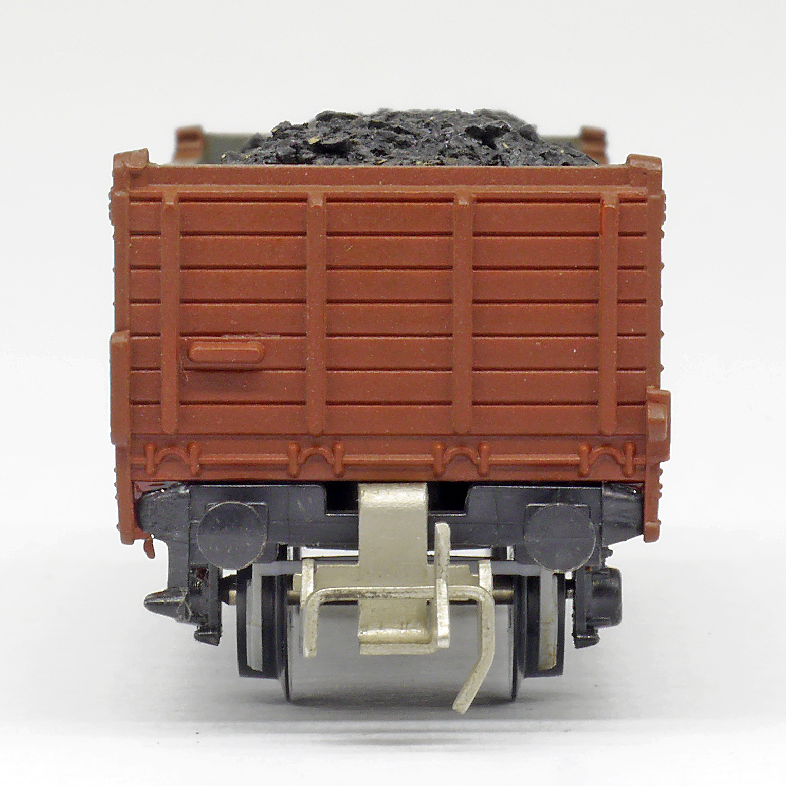 otevřený nákladní vůz červenohnědý ložený uhlím