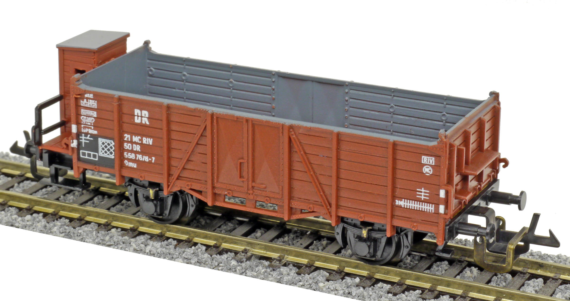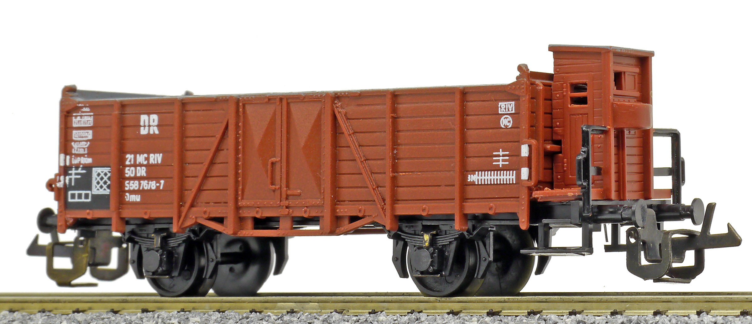 | otevřený nákladní vůz červenohnědý s brzdařskou budkou |
