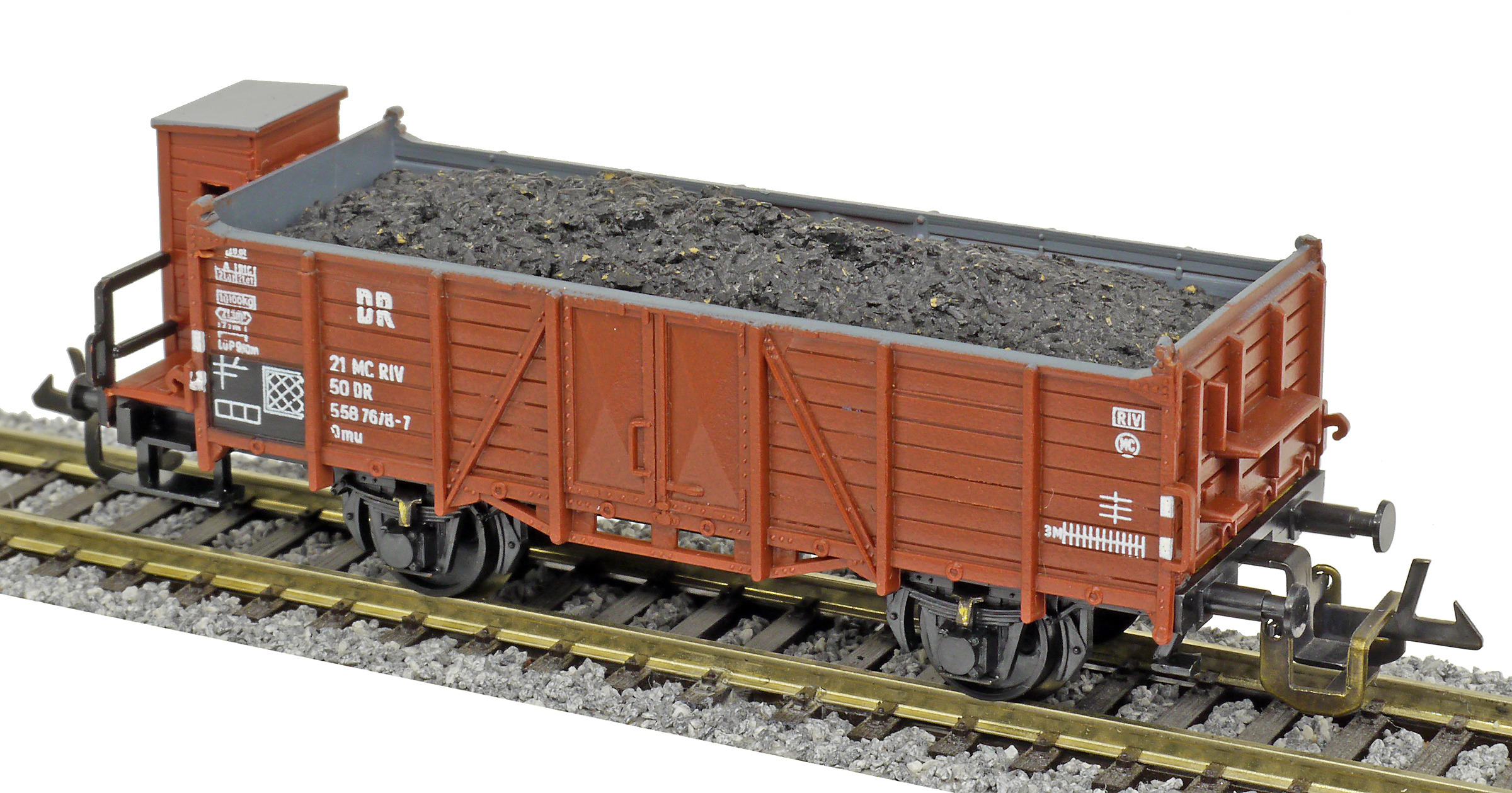 | otevřený nákladní vůz červenohnědý s brzdařskou budkou s nákladem uhlí |