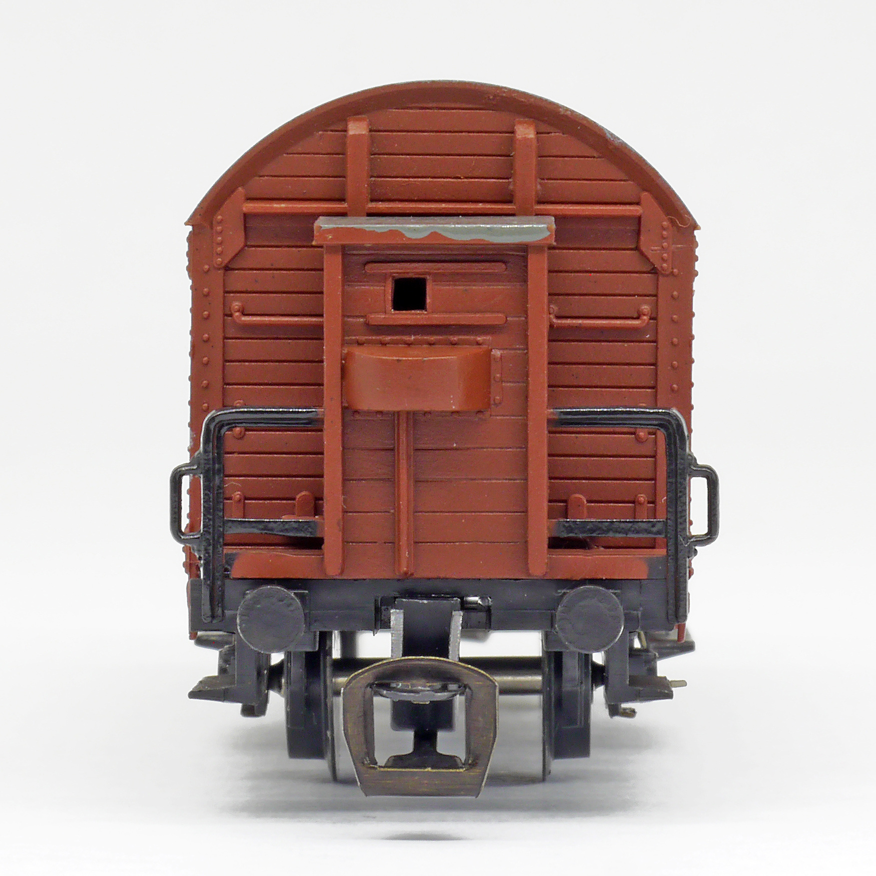 | krytý nákladní vůz červenohnědý s brzdařskou budkou |