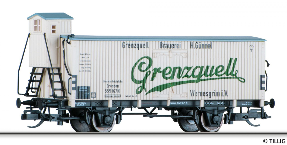 | chladící vůz bílý s šedou střechou a s brzdařskou budkou „Grenzquell Brauerei“ |