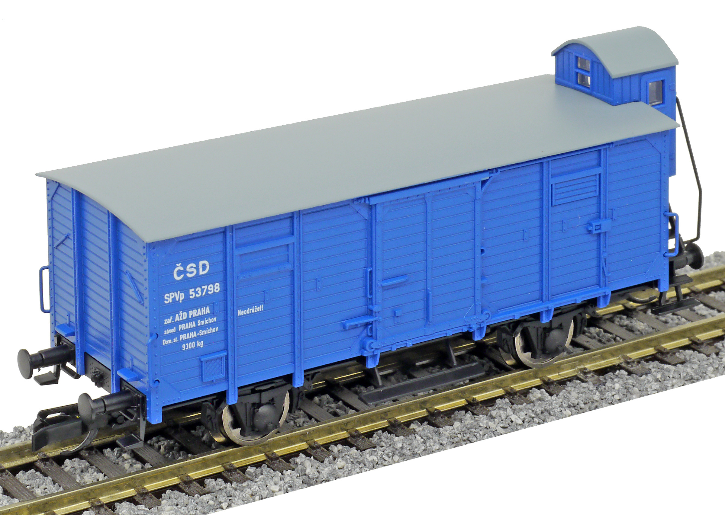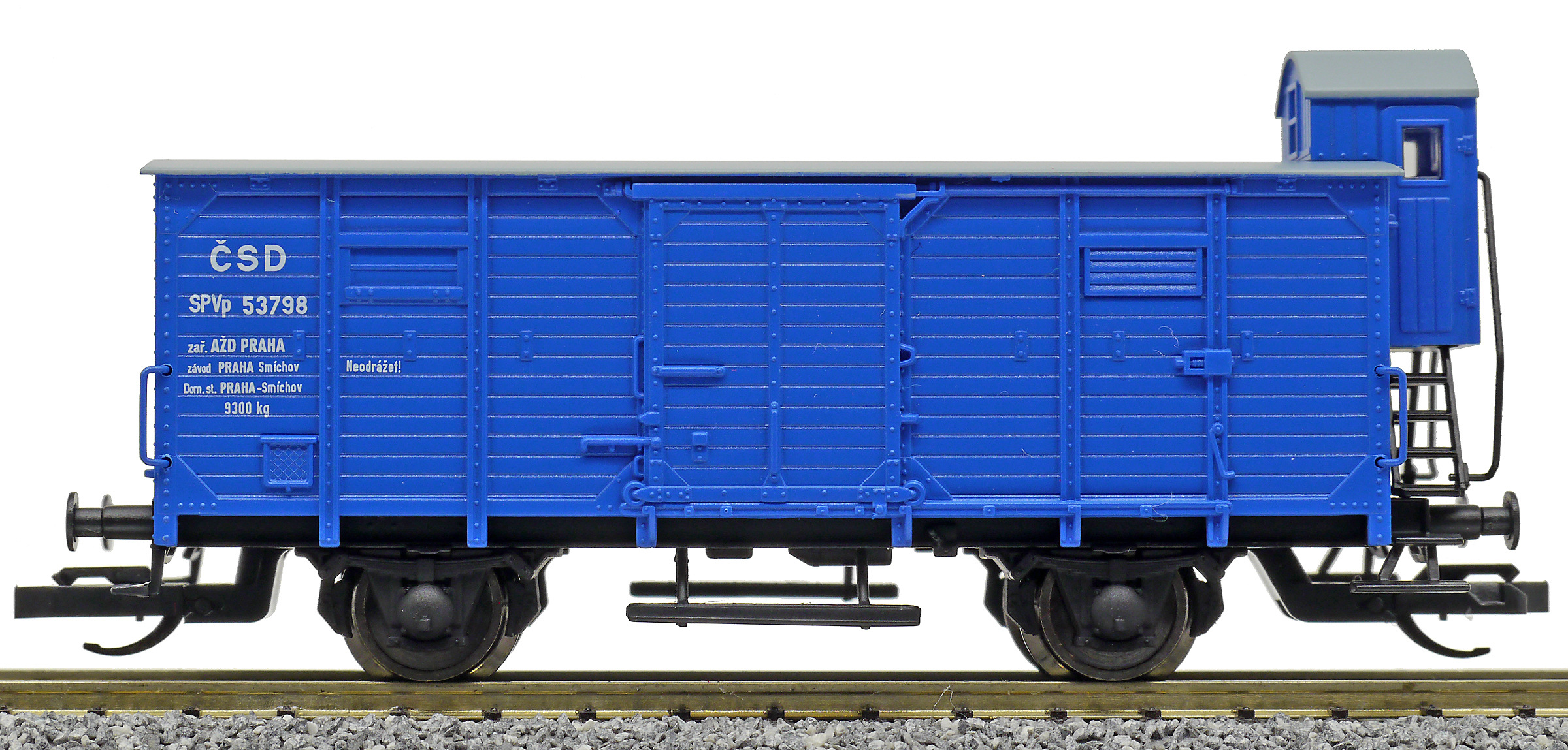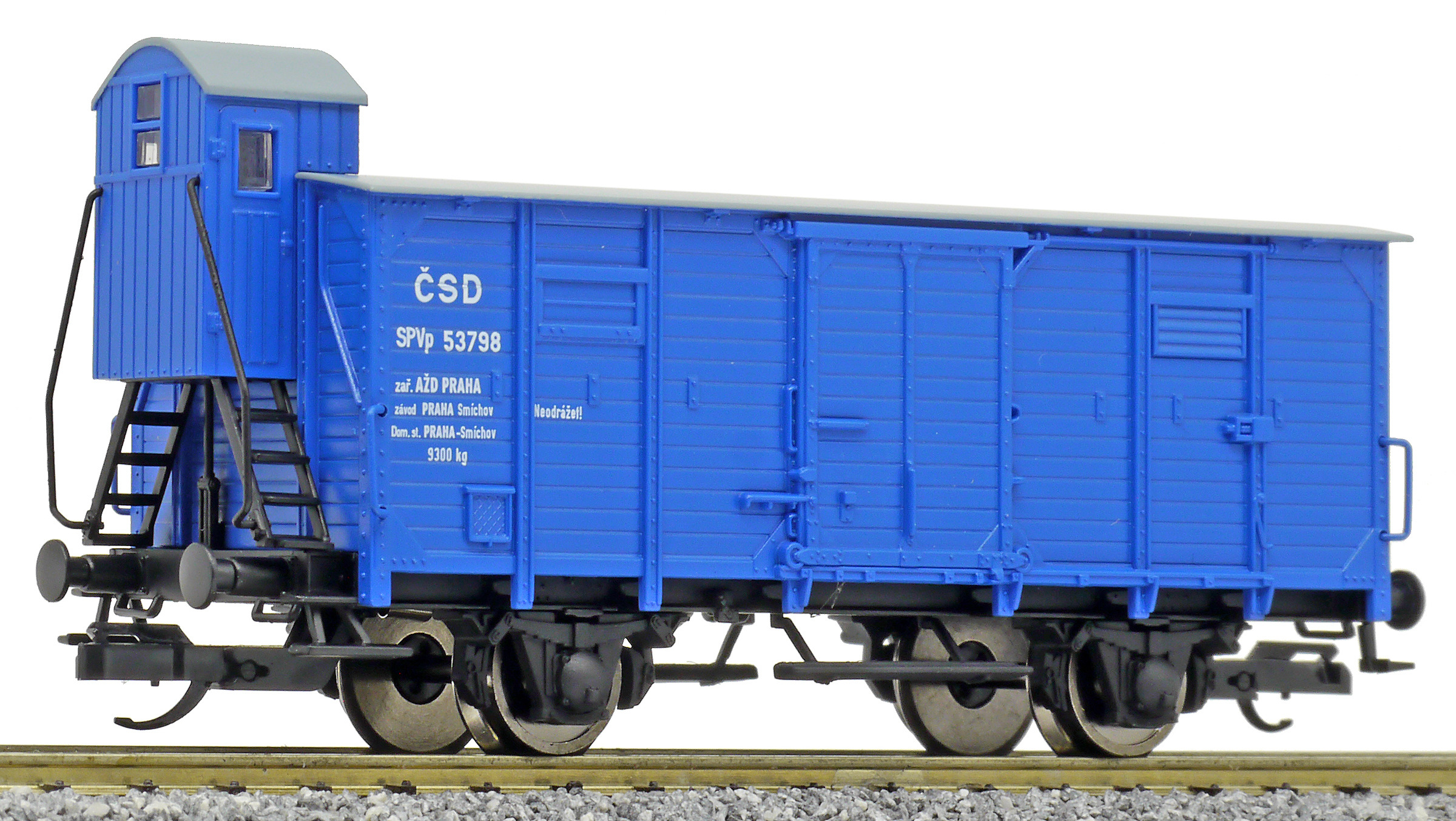Popis   krytý nákladní vůz modrý s černou střechou a s brzdařskou budkou