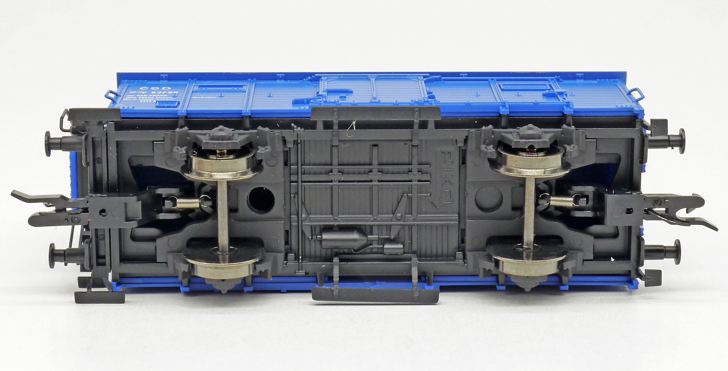 Kód   47777  [Nákladní vozy] → [Kryté] → [2-osé s nízkou střechou G02] → 47777: krytý nákladní vůz modrý s černou střechou a s reklamním potiskem „VEB PIKO“