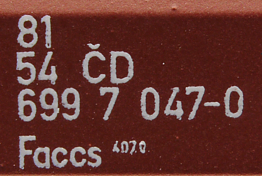 | • 81 54 699 7 047-0 | → | nákladní, s podvozky, ve vlastnictví železniční správy, pro mezinárodní dopravu dle zvláštních umluv |