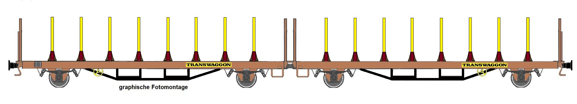 | dvojdílný plošinový nákladní vůz červenohnědý s nebarvenými klanicemi „Transwaggon“ |