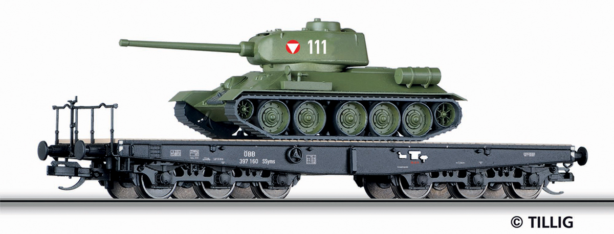 | plošinový nákladní vůz černý s nákladem tanku T34/85 |