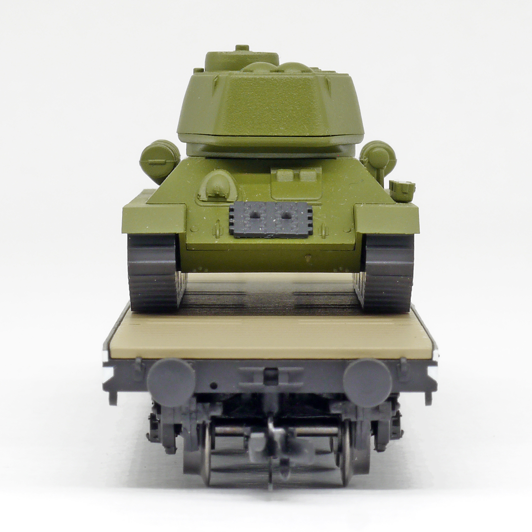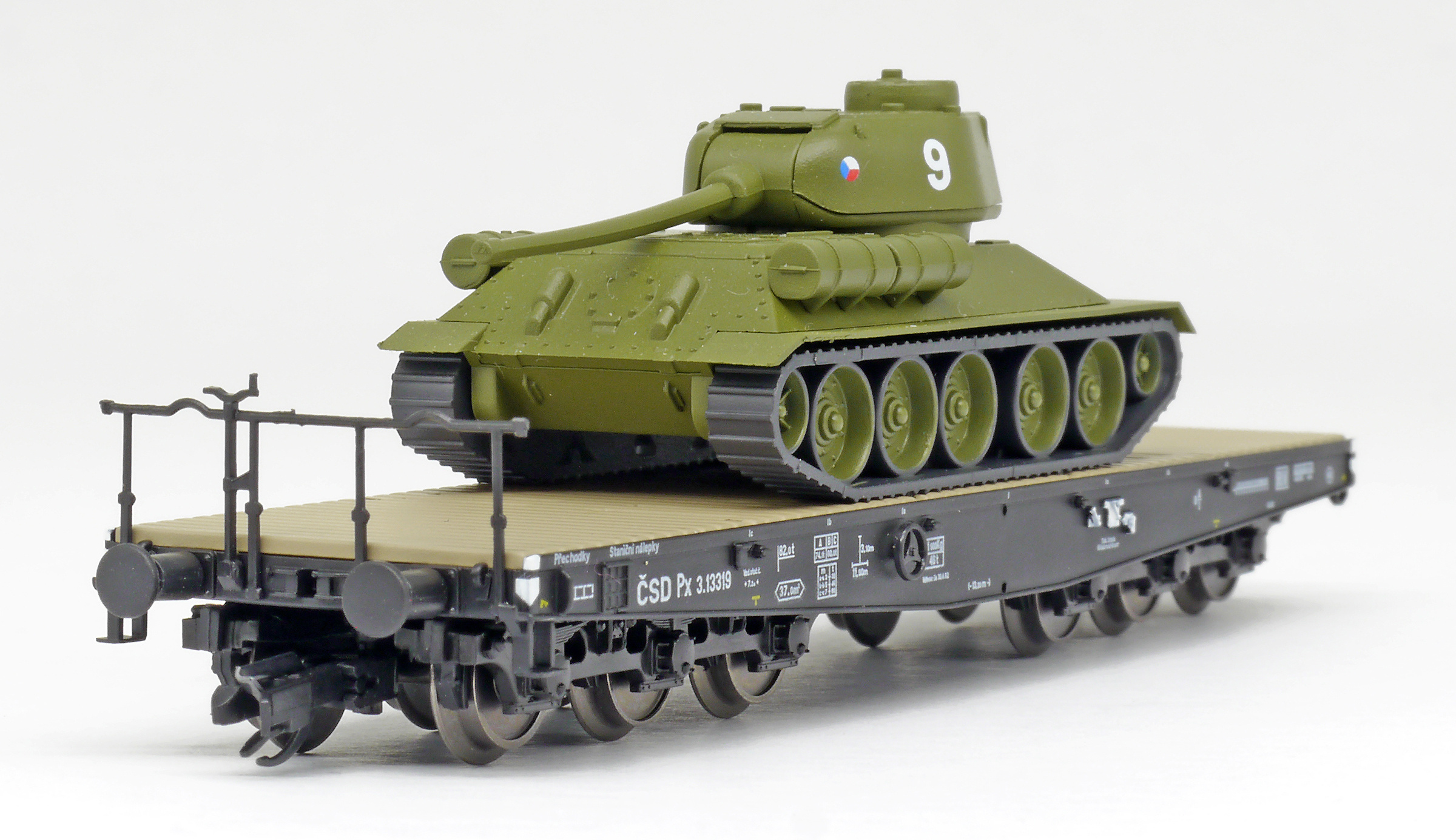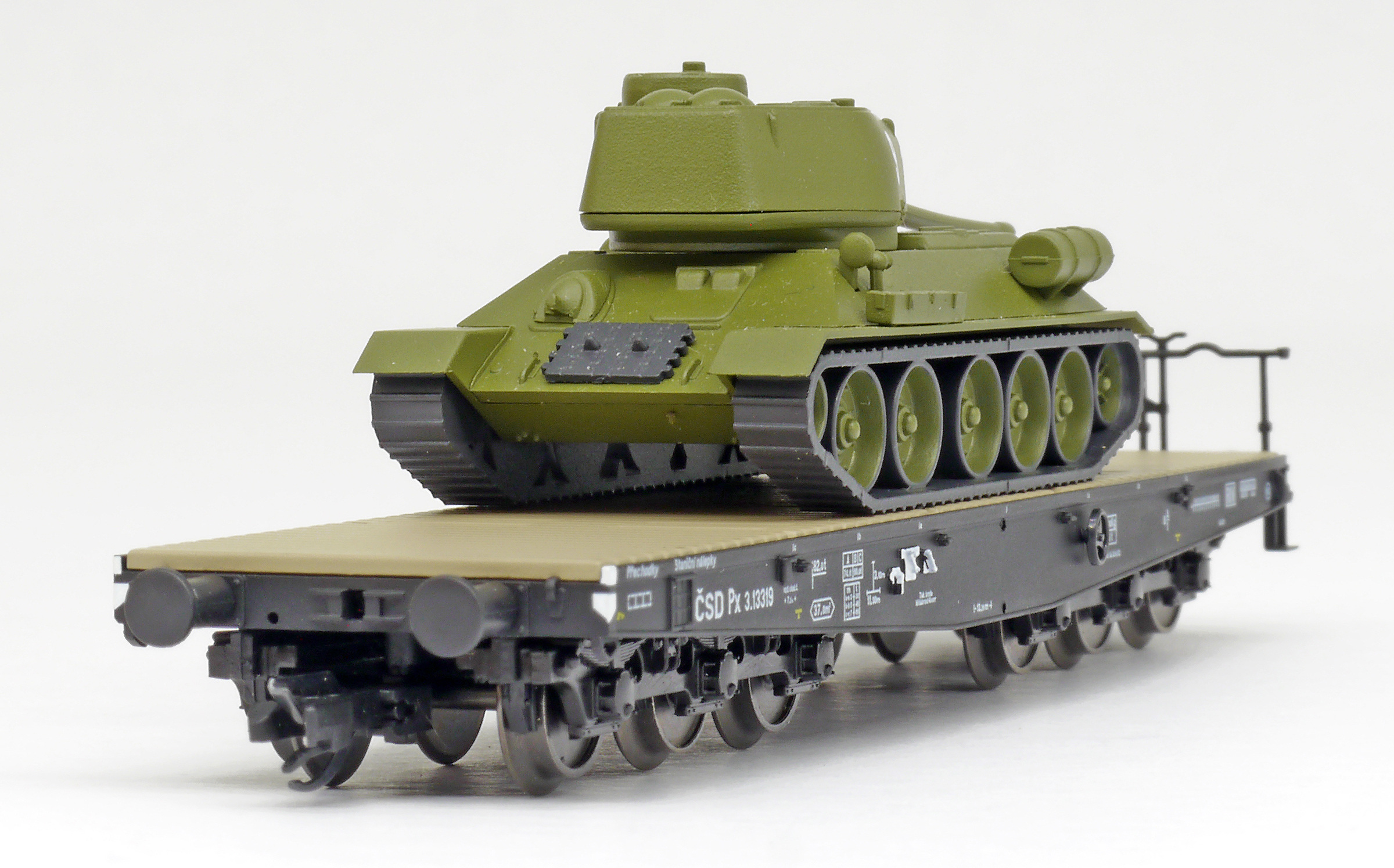 Kód   01801   ze SETu   [Nákladní vozy] → [Nízkostěnné] → [6-osé plošinové] → 01801: plošinový vůz s nákladem tanku T34/85