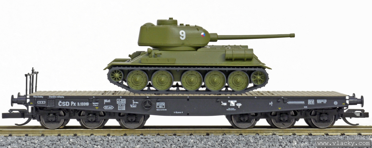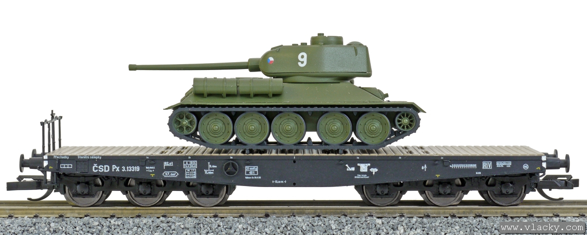 Kód   01674   ze SETu   [Nákladní vozy] → [Nízkostěnné] → [6-osé plošinové] → 01674: černý s nákladem tanku T34/85 č. 410