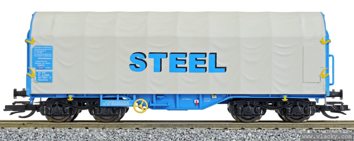 | plošinových vůz modrý s plachtou „STEEL“ |