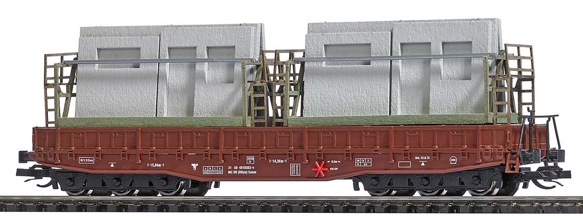 | nízkostěnný červenohnědý vůz s nákladem dvou KPB-25 s betonovými stavebními prefabrikáty |
