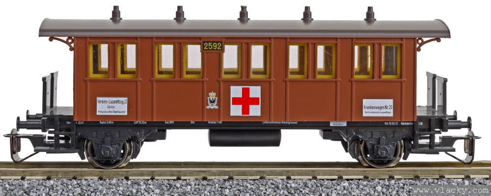 | červenohnědý vůz s hnědou střechou „Krankenwagen Nr. 20“ |