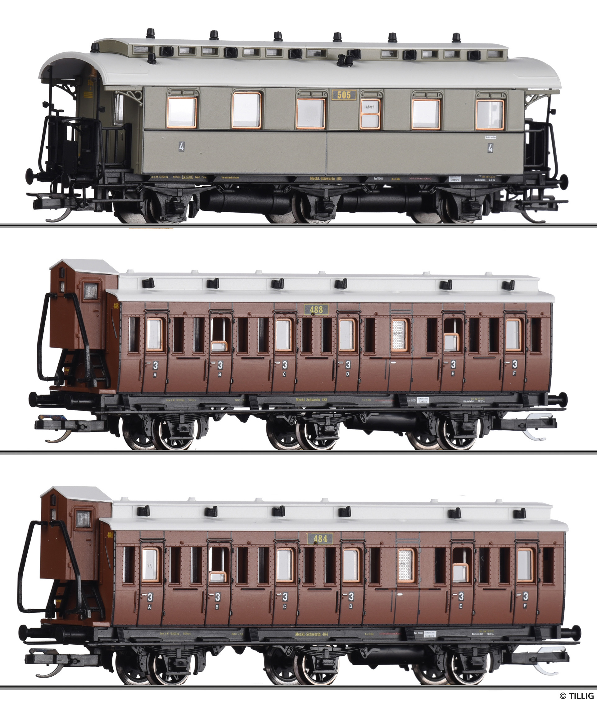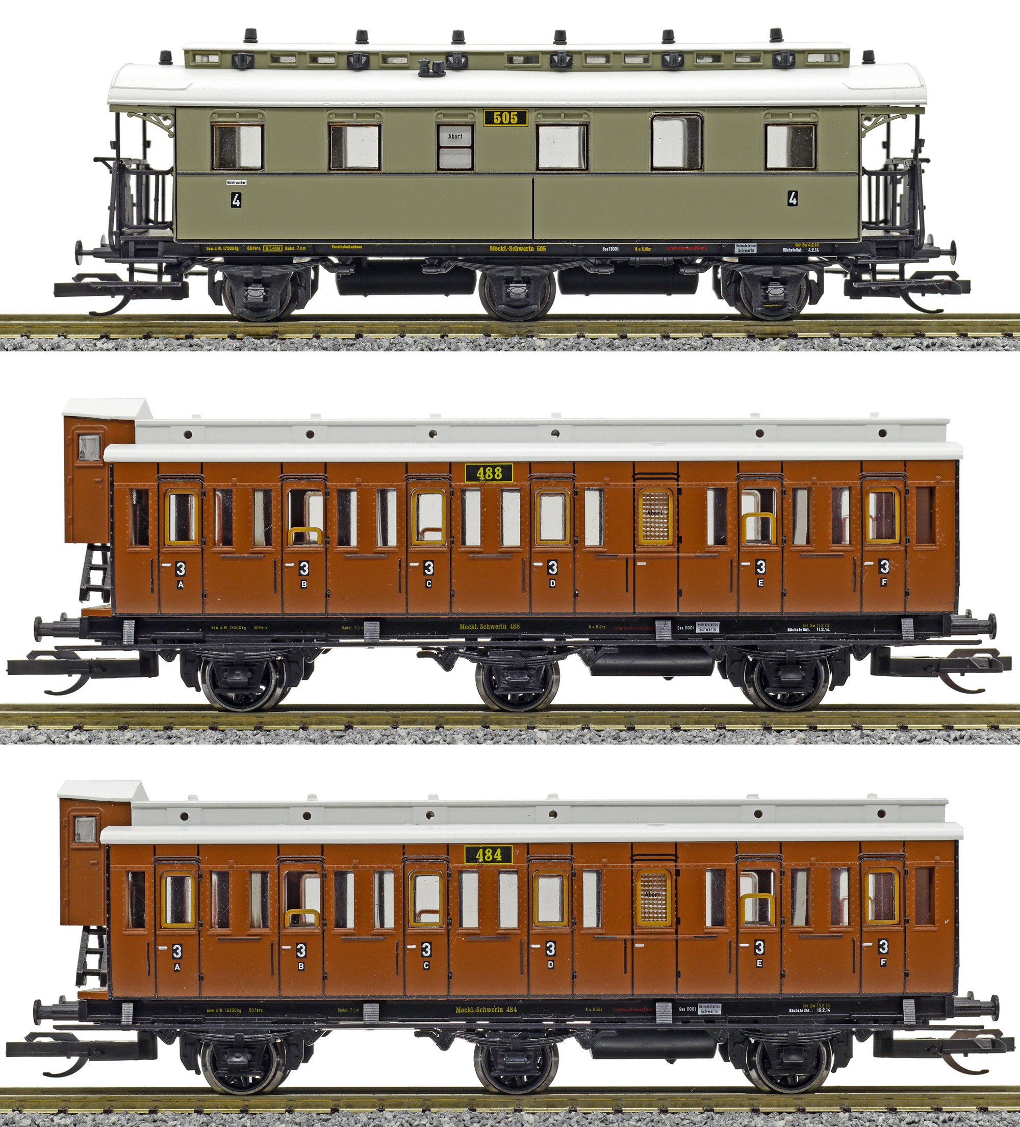 | oddílový osobní vůz červenohnědý se světle šedou střechou 3. tř. „Mecklenburgischer Reisezug 2“ |