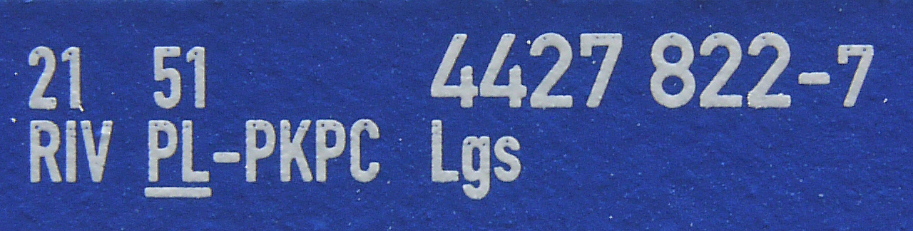 | • 21 51 4427 822-7 | → | nákladní, nezávislé nápravy, pevný rozchod, ve vlastnictví železniční správy, RIV, PPV |